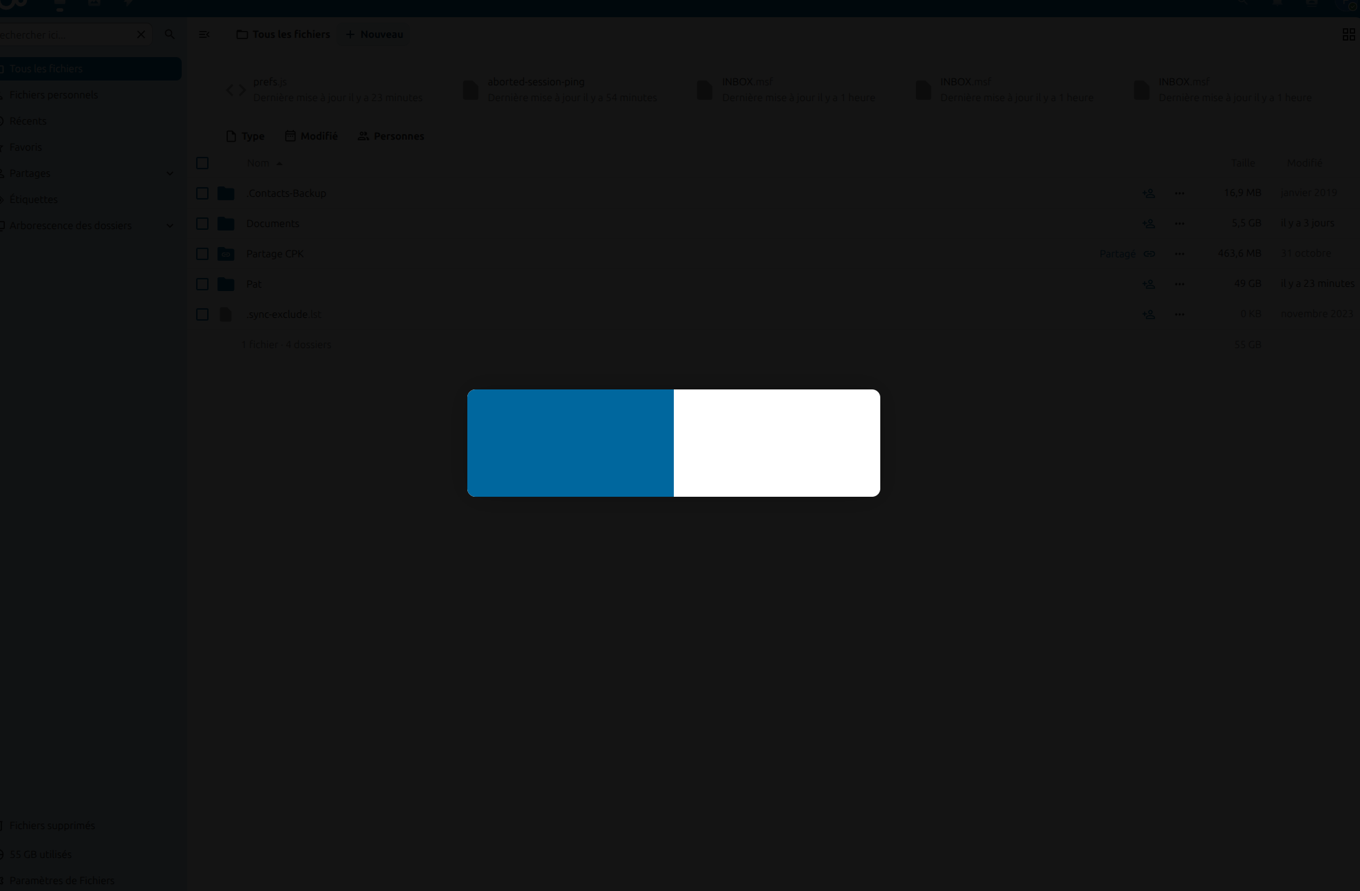 After migration, server seems OK and works fine with nextcloud client. When I try to connect with a local account or admin account, it is possible, but the environment windows is hidden by a sort of big blue switch. This ‘switch’ is unactive with the mouse. The first time I saw it was when I update to 30 or 31. A simple click on the sreen was enough to remove that ‘switch’. Now, it still it and I can’t remove it.
