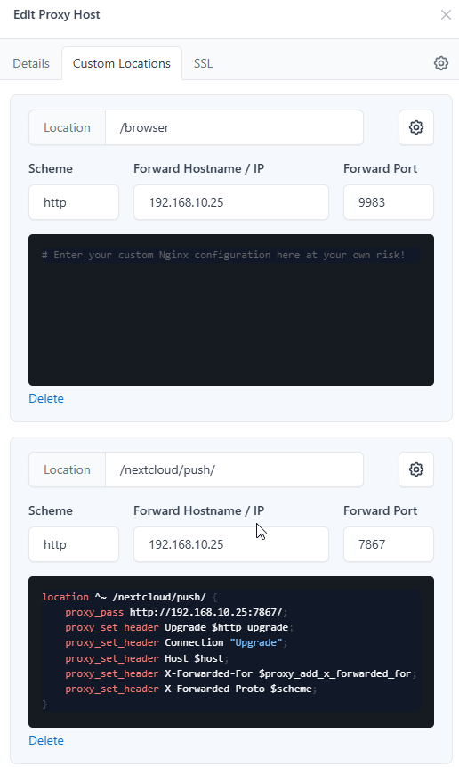 In NGINX Proxy Manager on my “Proxy Host” pointing to my nextcloud server I removed all existing custom locations. For this Proxy Host i addede the following custom Configuration: